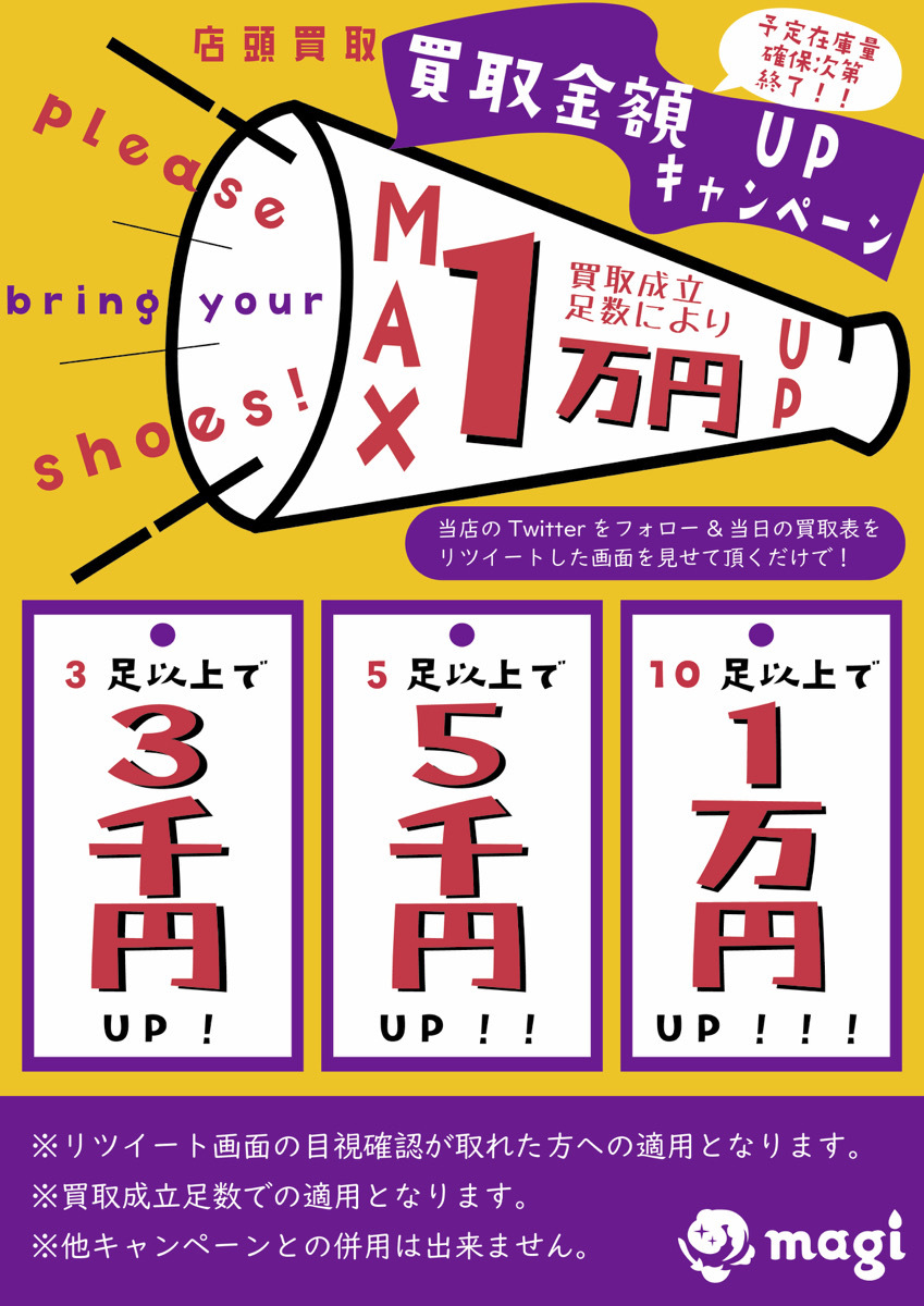 スニーカーの買取成立足数により買取価格MAX10,000円UPキャンペーン https://twitter.com/magi_OsakaNamba/status/1676115859738365954