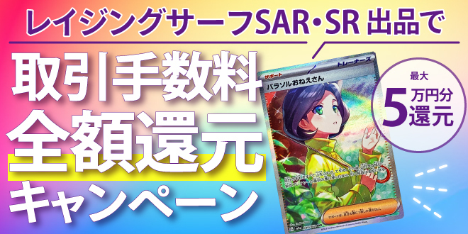 【最大5万円分還元】レイジングサーフ収録SAR・SRの出品・取引完了で取引手数料全額ポイントバックキャンペーンのお知らせ