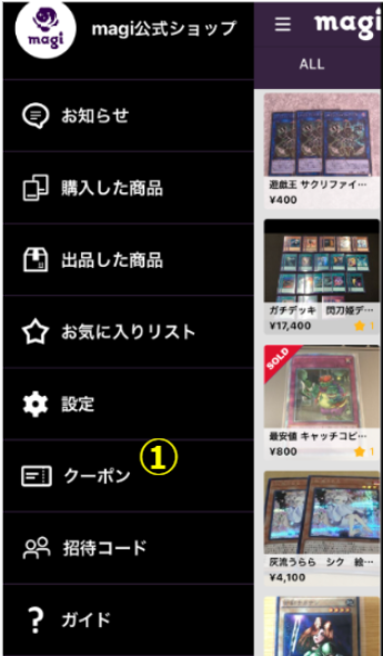 お世話になっております,magi運営事務局です。今回は、クーポン機能の紹介です! クーポンは付与されたタイミングでメールボックスにお知らせが届きます。 今後もたくさん色んな種類のクーポンを付与していく予定なのでぜひみなさん使ってみてください! 【クーポンの使い方】 ①メニューバーのクーポンから確認②クーポン一覧ページ:商品検索ボタンを押すと、クーポンが利用できる商品一覧ページに遷移します