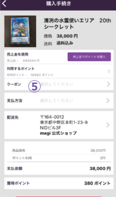 ⑤購入ボタンから購入手続きページに進むと、利用するポイントの下にあるクーポンの項目からクーポンを選択できます