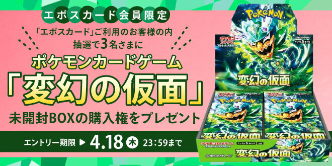 エポスNetのキャンペーンページよりエントリーし、エントリー期間中に「magi」でエポスカードを利用して1点以上商品をご購入いただいたかたから抽選で3名様にポケモンカードゲームスカーレット&バイオレット 強化拡張パック「変幻の仮面」の購入権をプレゼント!