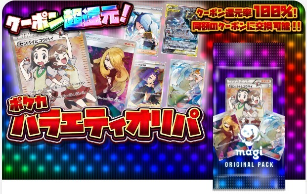 いつもmagiをご利用いただきありがとうございます! magi運営事務局でございます。 クーポン超還元!バラエティオリパ!!を新発売いたします。 オリパで収録されているカードの一例はこちらです! 【1等】 センパイとコウハイ SR 077/070 シロナ SR 070/066 【2等】 コルニの気合い SR 079/070 カヒリ SR 065/060 などこの他にも魅力的なカードを揃えました! その他販売しているオリパはこちらから確認ください 当選したカードは¥7,000 OFFクーポンに変換することもできます。 クーポン還元率100%のお得なオリパなので、ぜひ挑戦してみてください!