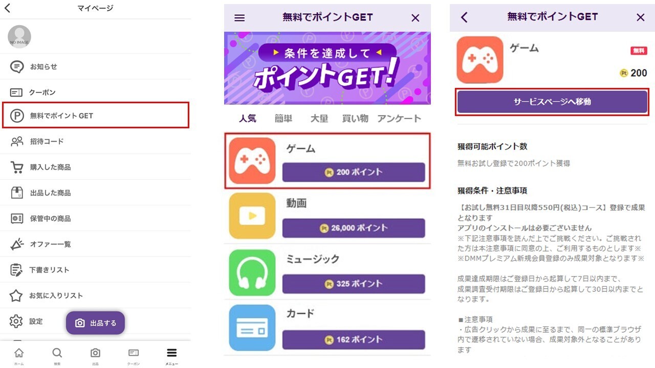 マイページ→「無料でポイントゲット」から、無料でポイントGETのページに遷移することができます。